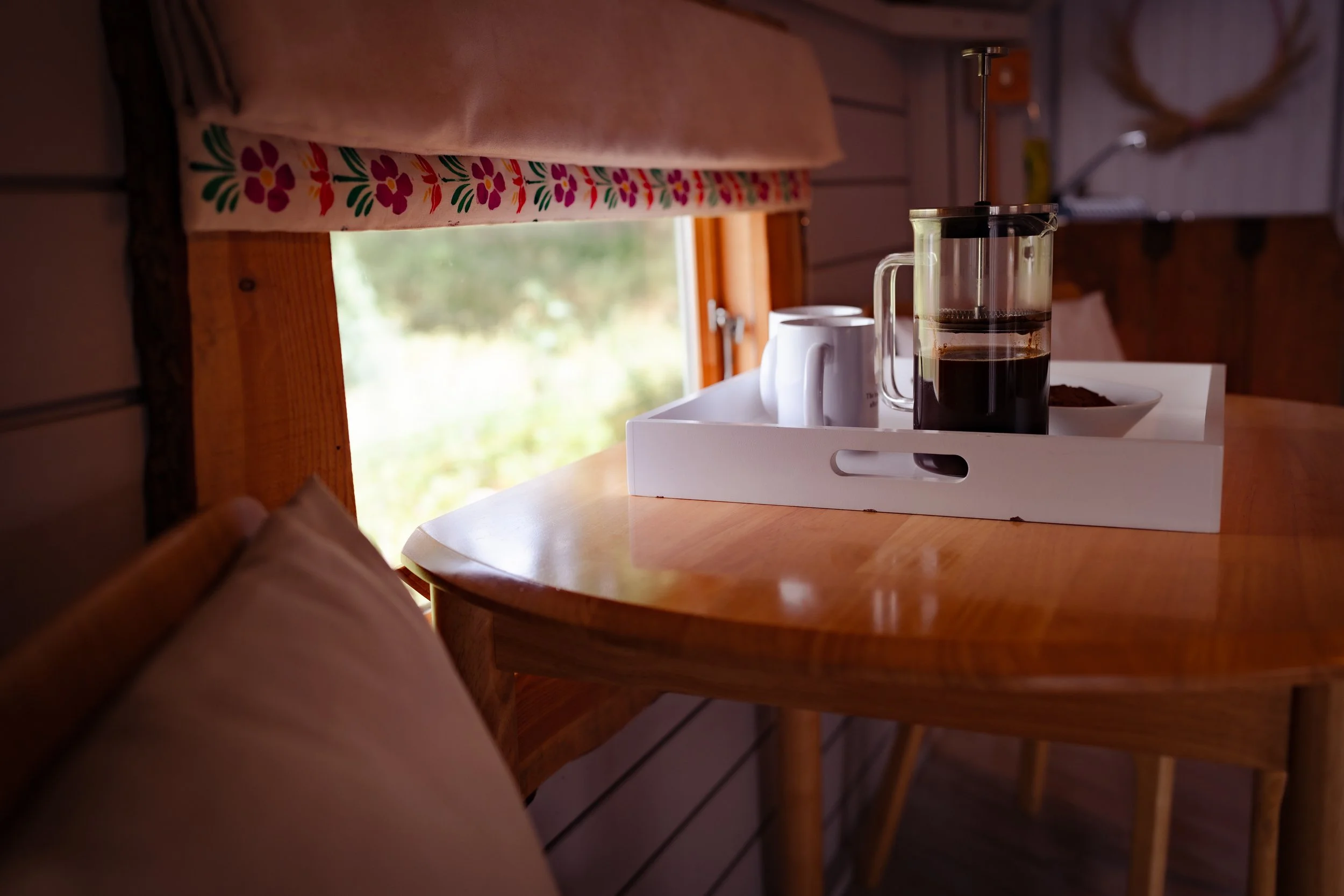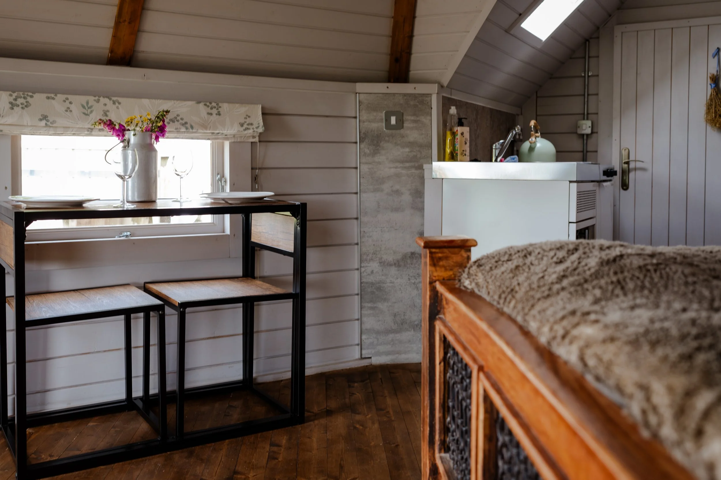 The insulated cabin is furnished with a king size bed, a small seating area and a chaise. The full glass door is so you can take in the magnificence of the Welsh border countryside from the comfort of your cozy bed with crisp hotel sheets. A BBQ is provided should you choose some alfresco dining or you can cook on your kitchenette which comprises of a fridge a hob and a microwave.